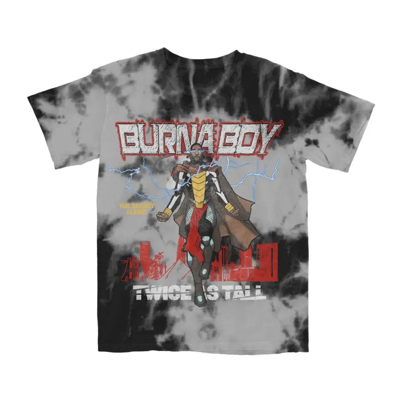 The Burna Boy 'The Secret Flame Tie Dye T-Shirt' here has the comic book character printed on the front of this black tie dye unisex t-shirtStock is due December 2020