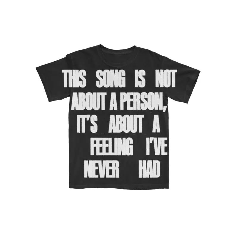 The Charlie Puth ‘This Song (Black) T-Shirt’ here features ‘THIS SONG IS NOT ABOUT A PERSON, IT’S ABOUT A FEELING I’VE NEVER HAD’ in white text on a black unisex
