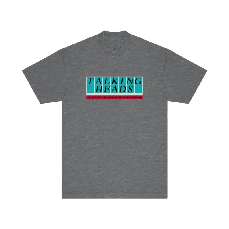Coal gray t-shirt with a tiled logo design on the front, inspired by the More Songs About Buildings and Food album cover.