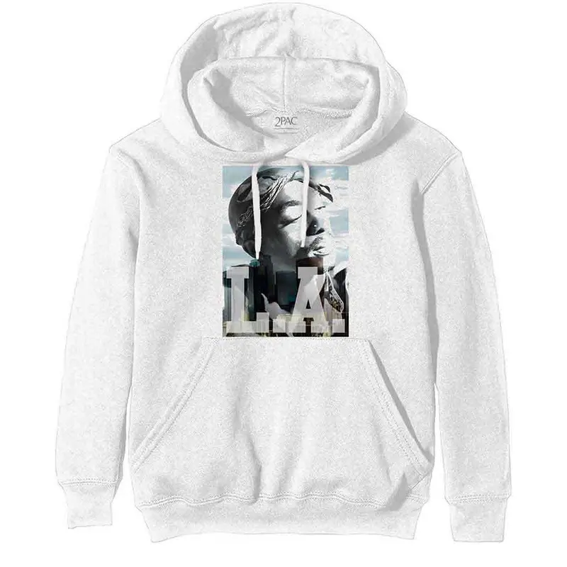 Tupac LA Skyline White HoodieX-Large An official licensed Tupac Unisex Pullover Hoodie featuring the 'LA Skyline' design motif. This high quality Pullover Hoodie is available in a white colourway. High quality cotton unisex pullover hoodie featuring drawst