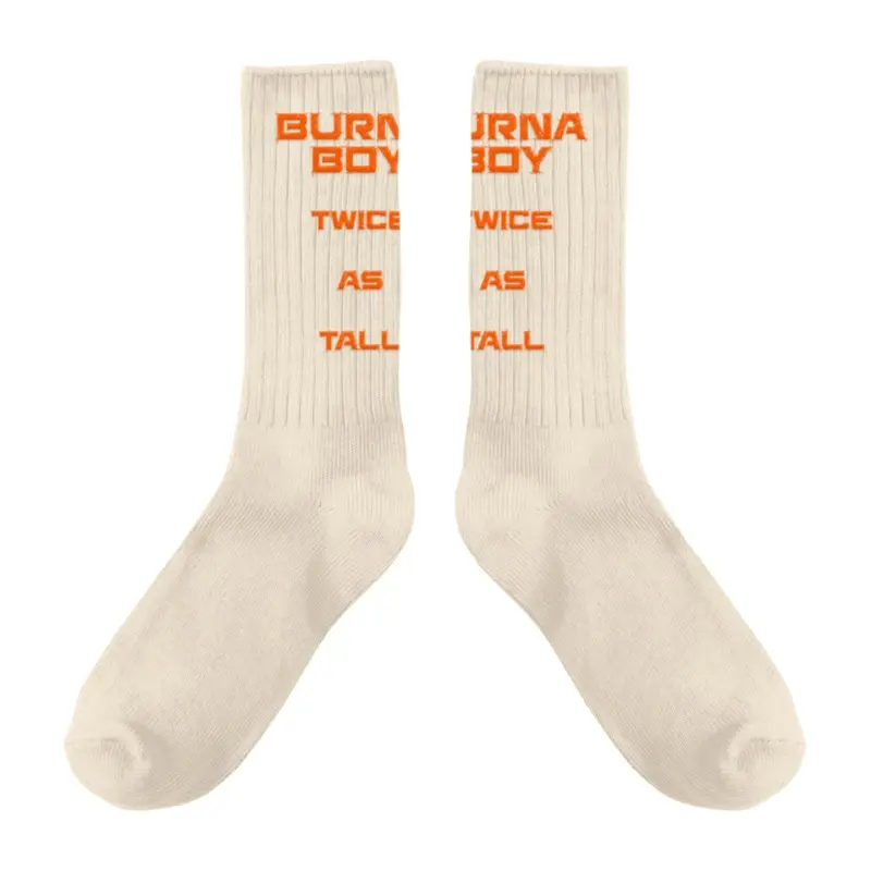 The Burna Boy 'Twice As Tall Socks' here are printed on a tan one size fits all socks.