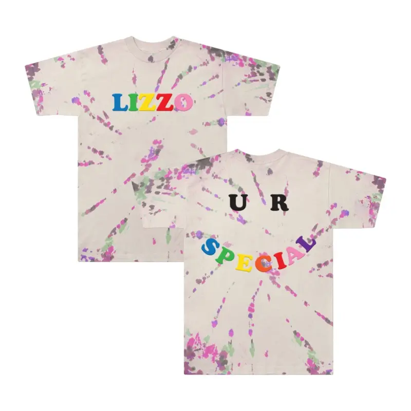 The exclusive multicolored tie dye t-shirt with a rainbow Lizzo logo on the front and U R Special embroidered on the back