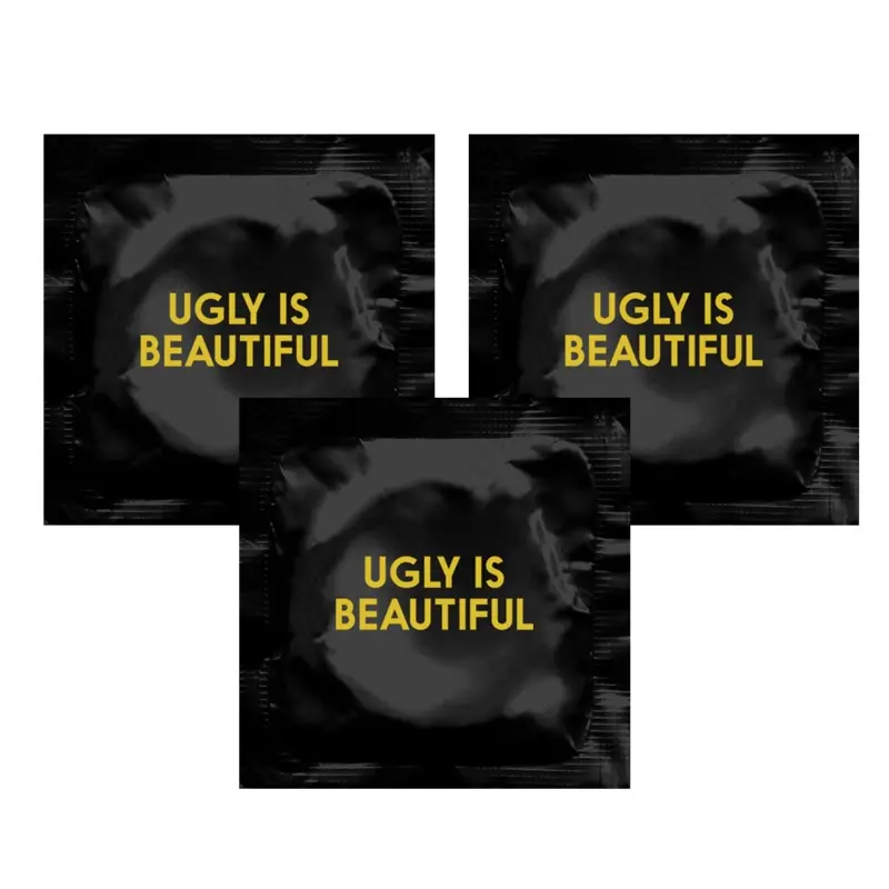 The Ugly is Beautiful Condoms from Oliver Tree feature the text “Ugly is Beautiful” printed in yellow on the top of black packaging. Includes three condoms.