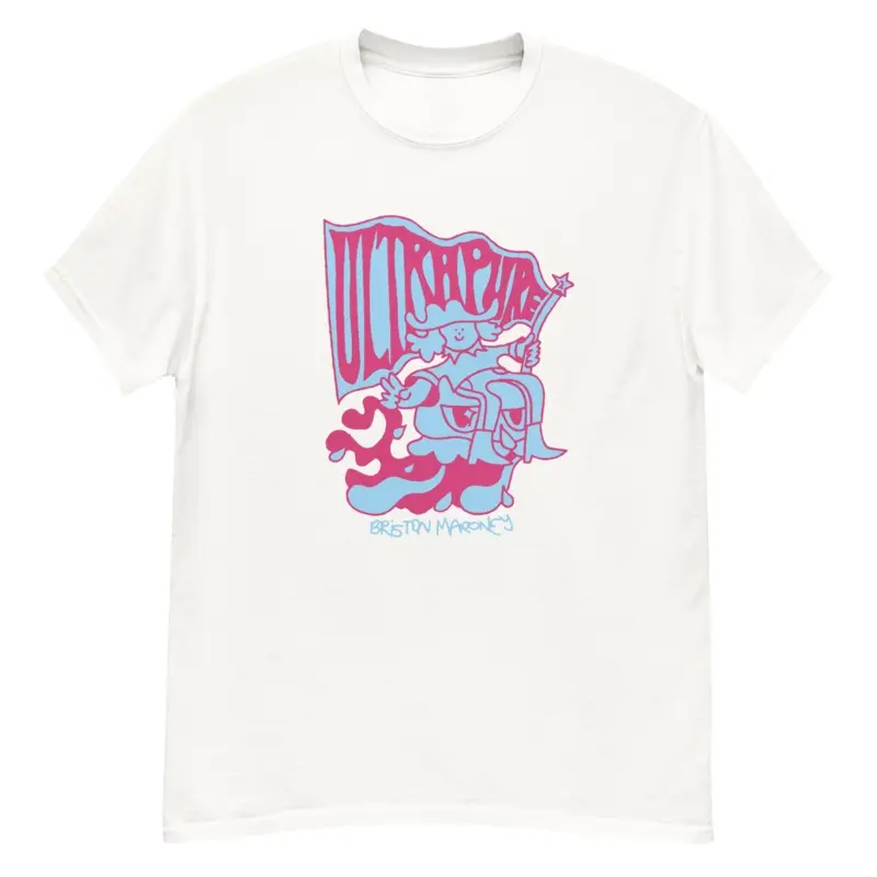 Briston Maroney white, unisex t-shirt featuring Ultrapure Caricature designThis product is made to order, please allow extra time for your order to be produced and dispatched.