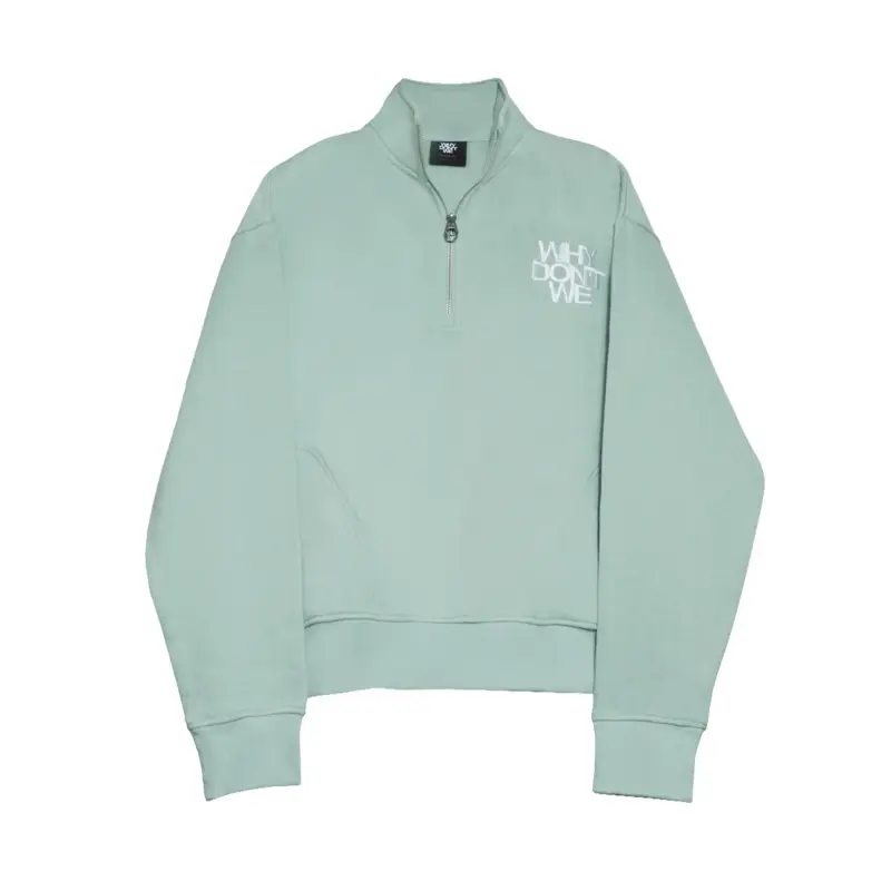 The Why Dont’ We ‘Quarter Zip Fleece (Green)’ features a white ‘Why Don’t We’ logo on the top left of the front of the fleece. This design is on a green unisex quarter zip fleece.