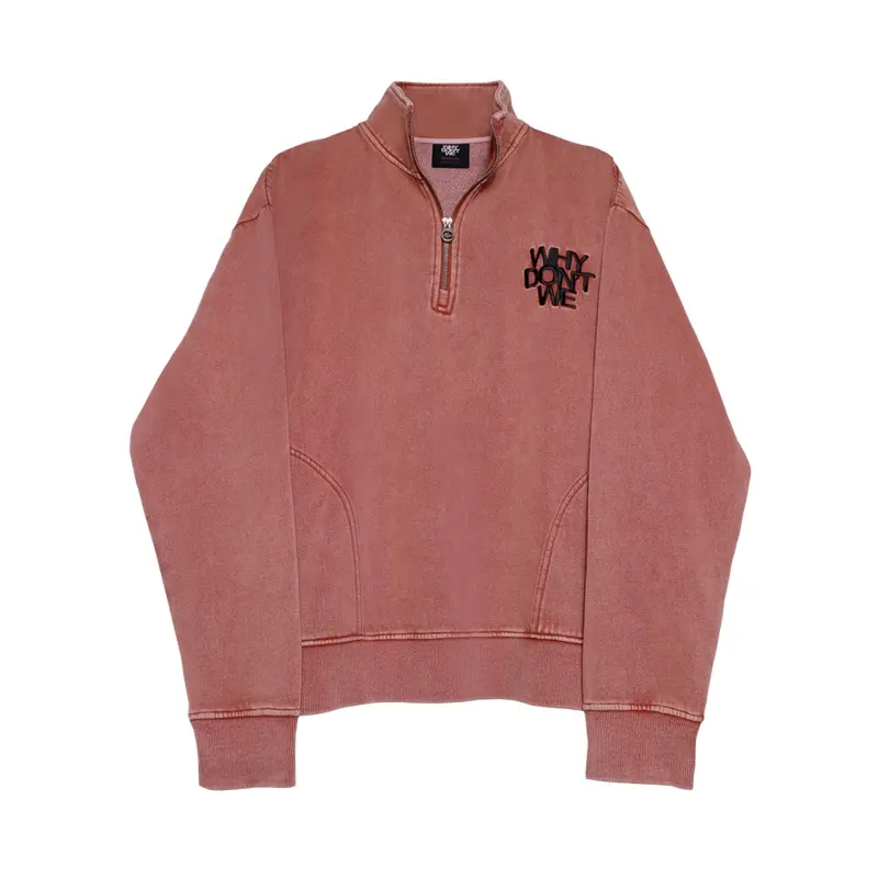 The Why Dont’ We ‘Quarter Zip Fleece (Red)’ features a black ‘Why Don’t We’ logo on the top left of the front of the fleece. This design is on a distressed red unisex quarter zip fleece.