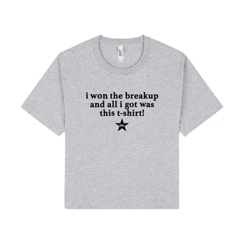 Heather grey 100% cotton boxy t-shirt.Features "i won the breakup and all i got was this lousy t-shirt!" lyric and MP star shaped logo screenprint on the front. Perfect for Valentines Day.